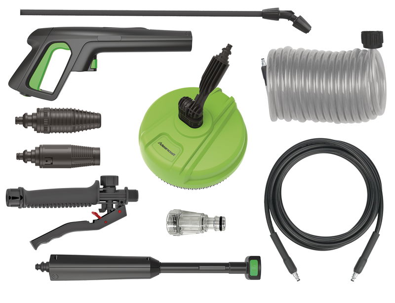 - Praktische Halterungen für Handspritzpistole, Strahlrohr, Hochdruckschlauch und Netzkabel